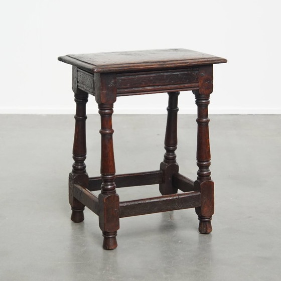Dieser zeitlose antike englische Hocker/ Joint Hocker/ Beistelltisch aus dem 17. Jahrhundert vereint Charme und Funktionalität. Jahrhundert vereint Charme und Funktionalität. Durch sein Alter und den jahrelangen Gebrauch hat er eine schöne Patina und ein warmes, charaktervolles und elegantes Aussehen erhalten. Er passt sowohl in klassische als auch in moderne Interieurs. Dank seiner robusten Konstruktion kann er nicht nur als stilvoller Beistelltisch dienen, sondern auch problemlos eine zusätzliche Sitzgelegenheit bieten. Durch den jahrelangen verantwortungsvollen Gebrauch weist er normale Gebrauchsspuren auf. Strukturell ist er in einem guten und sofort nutzbaren Zustand und wird Ihnen bei entsprechender Nutzung und Pflege viele Jahre Freude bereiten!