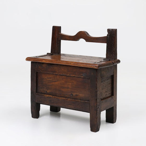 Frankreich / 16. Jahrhundert / Hocker mit Ablage / Holz / Rustikal / Mid-Century Dieser rustikale Hocker stammt aus dem 16. Jahrhundert und wurde in Frankreich gefertigt. Die schöne Patina zeugt von seiner großen Geschichte. Die Sitzfläche kann aufgeklappt werden, um ein Staufach freizulegen. Mit seiner bemerkenswerten Patina erinnert das Design an die Wabi-Sabi-Philosophie, bei der es darum geht, die Schönheit der natürlichen Unvollkommenheit zu schätzen. Ref. 24-0453