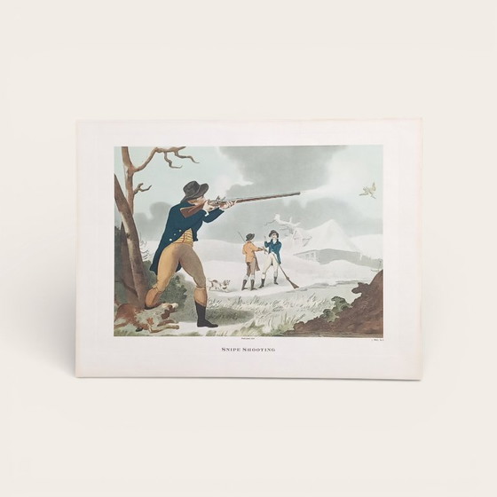 Das Bild zeigt eine traditionelle Jagdszene mit Jägern, Hunden und einer Landschaft. Es ist in feinen Linien mit Aquatinta-Schattierung und originaler Handkolorierung ausgeführt. Diese Art von Druck war in englischen Landhäusern und Jagdeinrichtungen sehr beliebt.