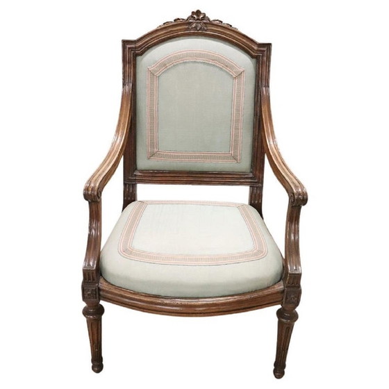 Schöner antiker italienischer Louis-XVI-Sessel aus massivem Nussbaumholz aus dem 18. Jahrhundert. Eine imposante großen Sessel mit einem breiten und bequemen Sitz. Sehr linear durch kleine und raffinierte Dekorationen in das Holz geschnitzt gekennzeichnet. In perfektem Zustand von Holz, Polsterung und Stoff. Perfekt für einen Schreibtisch zu verwenden. Der Sessel ist in perfektem antiken Zustand bereit, in Ihrem Haus verwendet werden.