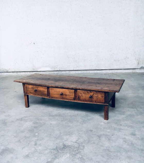 Antiker, rustikaler spanischer Konsolentisch aus dem 18./19. Jahrhundert in warmem Kastanienbraun mit drei Schubladen. Hergestellt in Spanien. Der Beistelltisch aus Massivholz befindet sich im Originalzustand. Die Tischplatte besteht aus einem einzigen Stück massivem Kastanienholz. Sie besticht durch eine wunderschöne Maserung und einen warmen Braunton und weist deutliche Gebrauchsspuren auf. Das Gestell hat schlichte, quadratische, leicht konische Beine und drei Schubladen mit erhöhten, quadratischen Fronten und gedrechselten Holzgriffen. Der Tisch hat eine wunderschöne Farbe mit einer tollen Patina und tiefem Glanz. Die Maserung des Kastanienholzes ist im gesamten Holz sichtbar. Der Tisch ist sehr stabil und sofort einsatzbereit. Maße: 49 cm x 178 cm x 64 cm.
