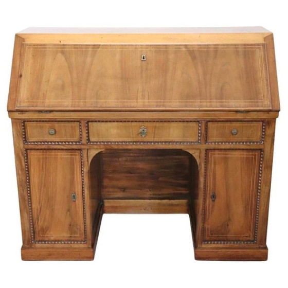 Er ist aus edlem, massivem Nussbaumholz in einem hellen, honigfarbenen Farbton gefertigt und zeichnet sich durch ein lineares Design aus, das mit subtilen, aber raffinierten gedrechselten Verzierungen geschmückt ist, die auf jeder Seite einen unverwechselbaren optischen Akzent setzen. Funktional bietet es drei praktische Schubladen auf der Vorderseite und zwei Seitenfächer mit Einlegeböden. Das Außergewöhnlichste ist der aufklappbare Deckel, der eine mit Kunstleder ausgekleidete Ablagefläche bietet, die sich perfekt zum Schreiben oder zum Nachschlagen von Dokumenten eignet. Im Inneren befinden sich vier kleine Schubladen, die mit vergoldeten Bronzeknöpfen verziert sind. Sie können diesen exquisiten Schreibtisch in jedem Raum Ihrer Wohnung aufstellen, um Ihre Büroarbeit zu erledigen, ohne auf die Eleganz Ihrer Einrichtung zu verzichten. Wo auch immer Sie ihn aufstellen, er wird ein Blickfang sein, der von all Ihren Gästen bewundert und beneidet wird. Durch seine elegante Schlichtheit passt er sowohl zu klassischen als auch zu modernen Einrichtungen.