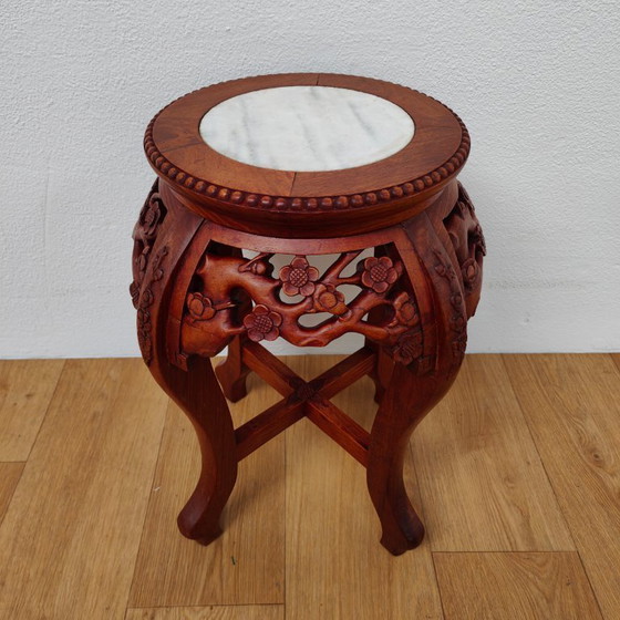 Verleihen Sie Ihrem Interieur mit diesem atemberaubenden Vintage-Pflanzentisch einen Hauch orientalischer Eleganz. Gefertigt aus warmem, rötlich-braunem Hartholz, zeugt dieser chinesische Blumenständer von der Handwerkskunst des frühen 20. Jahrhunderts. Die runde Tischplatte mit ihrer wunderschönen Intarsienarbeit aus weißem Marmor besticht sofort durch ihre Schönheit. Bewundern Sie die kunstvollen, durchbrochenen Holzschnitzereien mit ihren filigranen Kirschblüten an den Rändern. Die eleganten, geschwungenen Beine und das stabile Kreuzgestell verleihen dem Tisch eine unverwechselbare Silhouette. Die dezente Patina und die natürliche Holzmaserung unterstreichen den einzigartigen Vintage-Charakter dieses Prachtstücks. Nutzen Sie ihn als klassischen Podest für einen großen Farn oder lassen Sie ihn als luxuriösen Beistelltisch neben Ihrem Lieblingssessel erstrahlen. Ein authentischer Blickfang voller Geschichte!