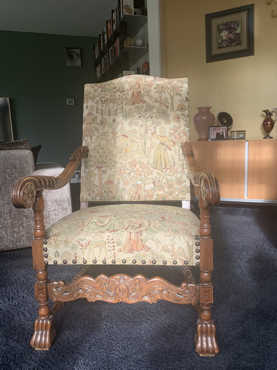 Wunderschöner antiker Sessel. Charakteristisch, sehr solide, luxuriöse Polsterung, Stahlfedern im Inneren auf Jutegurten und unbeschädigte Holzschnitzereien, alles in neuwertigem Zustand.