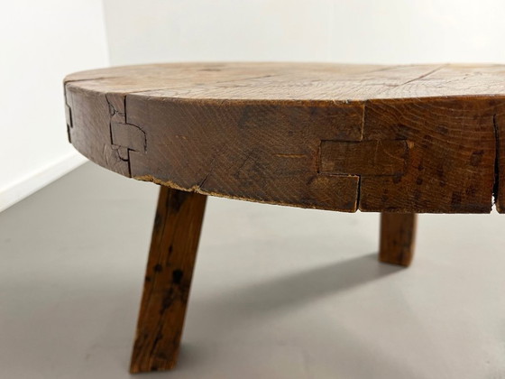 Antiker runder Couchtisch im spanischen Brutalismus-Stil aus massiver Eiche, 1930er Jahre