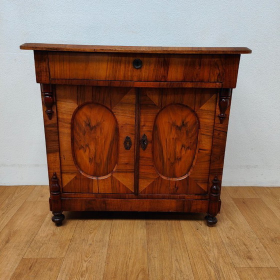 Antiker Flurschrank aus Holz. Dieser Schrank im spanischen Stil ist komplett aus Holz gefertigt und mit Nussbaumfurnier versehen. Der Biedermeier-Schrank besteht aus einer großen Schublade mit zwei darunterliegenden Flügeltüren, die jeweils über ein funktionierendes Schloss und einen Schlüssel verfügen. Dieser Schlüssel passt auch zum funktionierenden Schloss der Schublade. Ein wunderschöner Schrank mit ganz besonderem Charme. Die Oberseite des Schranks ist beschädigt, was jedoch altersbedingt ist. Deutliche Fotos davon liegen vor.