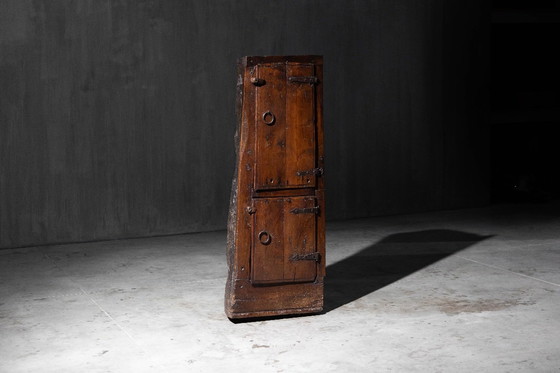 Dieser authentische Wabi-Sabi-Schrank zeugt von der Schönheit der Unvollkommenheit und zeitloser Handwerkskunst. Handgeschnitzt aus einem einzigen Stück Holz, besticht er durch natürlich unebene Kanten, gealterte Patina und handgeschmiedete Eisenbeschläge. Die asymmetrische Form und die organische Textur verkörpern rustikale Schlichtheit und japanische Ästhetik. Perfekt als skulpturales Aufbewahrungsmöbel oder zeitloses Design-Statement.