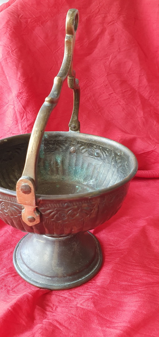 Dieser antike Weihwassereimer aus edlem Bronze ist ein wahrhaftiges Schmuckstück vergangener Zeiten. Mit seiner kunstvollen Gravur und dem eleganten Henkel verleiht er jedem Raum eine Aura von Geschichte und Tradition.