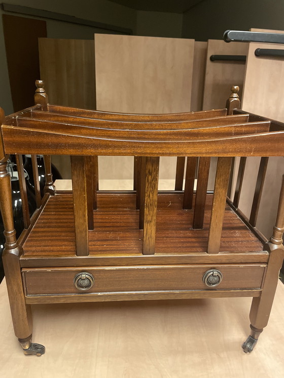 Verleihen Sie Ihrem Zimmer mit diesem antiken Zeitschriftenhalter Stil. Originale Messingräder und -beschläge.