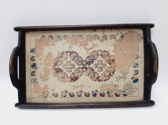 Antikes Holztablett mit Griff und Design unter Glas