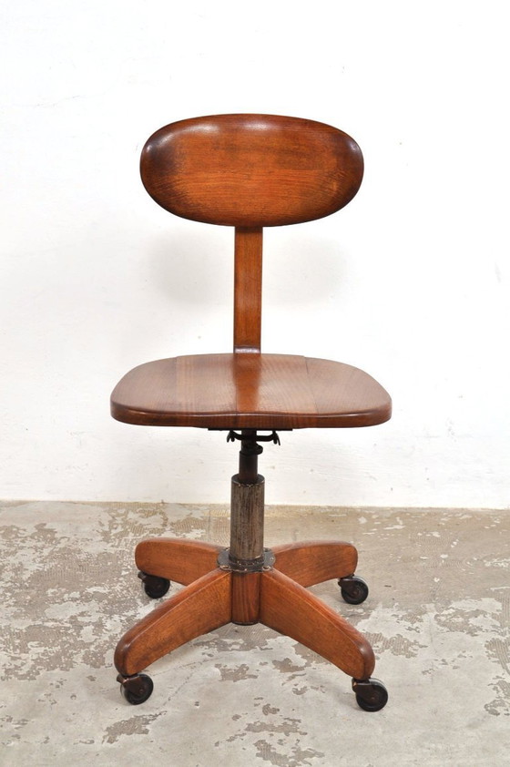 Buchenholz-Bürostuhl von Albert Stoll (Deutschland) in schönem Zustand nach fast hundert Jahren! Der Stuhl steht auf 4 Rollen, ist höhenverstellbar, die Rückenlehne ist in der Höhe verstellbar und kann gekippt werden (Gegendruck im Rücken).