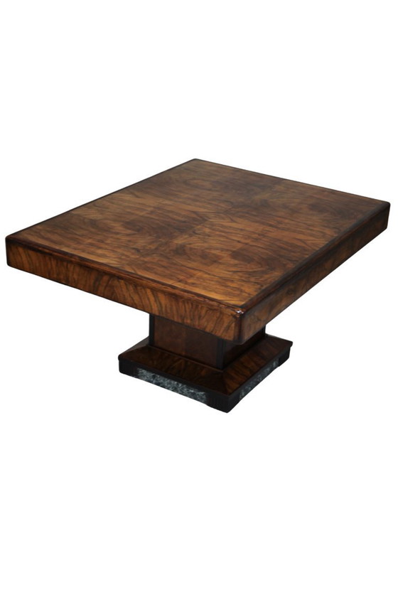 Art-Deco-Esstisch aus Nussbaum-Maserfurnier mit grünen Marmordetails am Fuß.