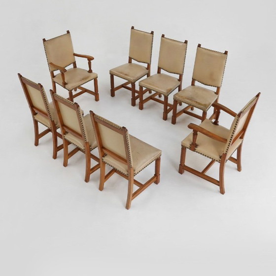 Belgische Art Deco-Esszimmerstühle aus massiver Eiche und Leder.