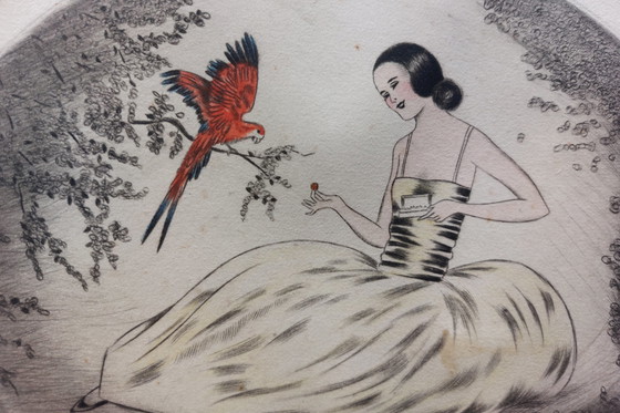 Art-Deco-Farbradierungen. Mit dem Titel "Mädchen mit rotem Papagei".