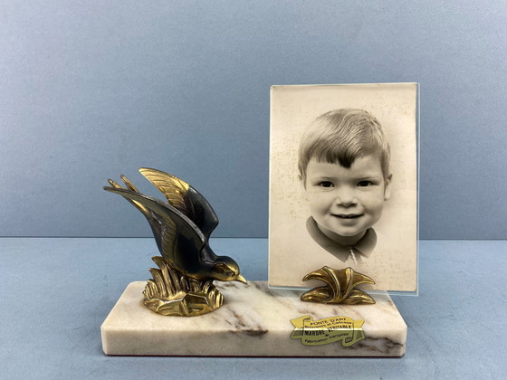 Fotohalter mit fliegendem Vogel Das Foto ist nicht im Lieferumfang enthalten und dient nur der Illustration. Material: Marmor, Zamak und Glas Abmessungen: Länge 20 cm / 7.9 inches Höhe 17.5 cm / 6.9 inches Tiefe 6.5 cm / 2.6 inches Gewicht: 1.3 kg Zustand: guter Zustand. Wenn es ein Bild zwischen den Glasplatten gibt, dann schließt das Glas nicht mehr zusammen, siehe Foto 2.