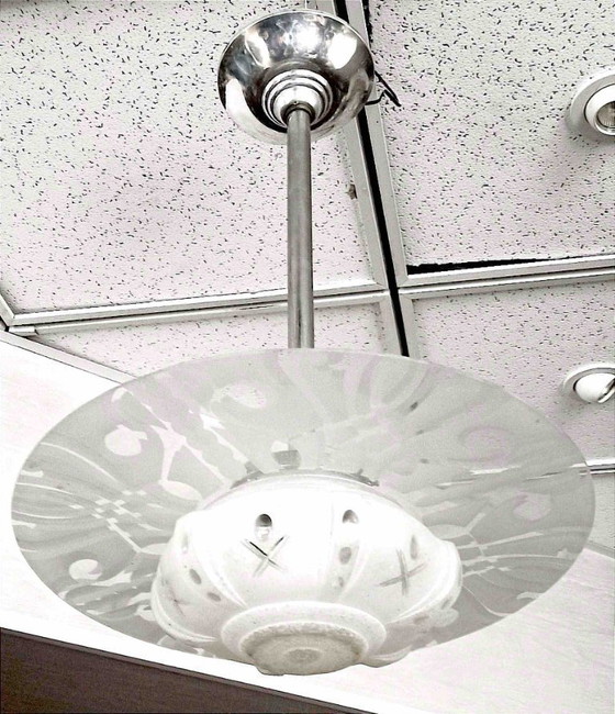 Verleihen Sie Ihrem Zuhause mit dieser eleganten Pendelleuchte (45 cm Durchmesser) den zeitlosen Charme des Art déco. Dieses Schmuckstück aus Glas und Metall ist die perfekte Ergänzung für jeden Raum und besticht durch sein raffiniertes Design.