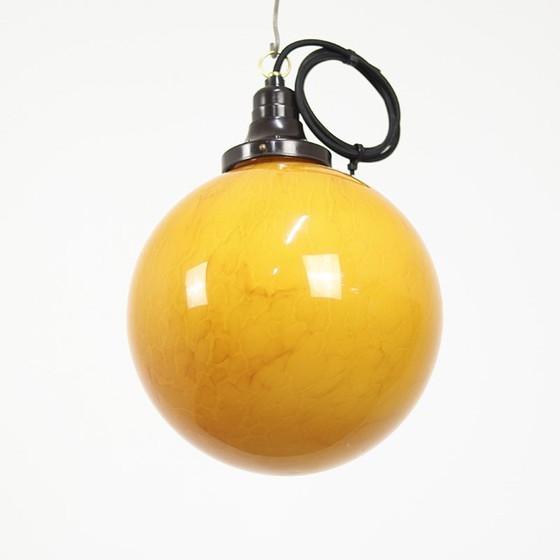 Außergewöhnliche Pendelleuchten im Art-Deco-Stil mit Bakelitbeschlägen. Die Pendelleuchten haben einen sehr dekorativen Glasschirm mit dunkelgelbem marmoriertem Glas. Die Lampen haben eine neue Verkabelung und funktionieren mit einer Standard E27 Bakelit-Fassung, die in die Bakelit-Schirmhalterung integriert ist. Lediglich eine Kette und eine Deckenkappe/Rosette müssen noch besorgt werden. Wir haben derzeit noch 9 dieser Lampen auf Lager, der Preis gilt pro Stück. Wenn Sie mehr Lampen kaufen möchten, senden Sie bitte eine Nachricht! 25cm Durchmesser Glühbirne. 100cm langes Kabel.