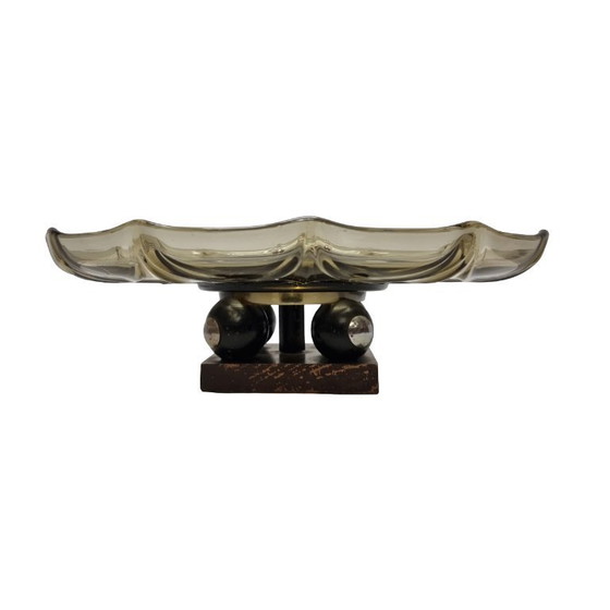 Diese französische Art-déco-Schale aus Rauchglas aus den 1920er-Jahren ist ein einzigartiges und dekoratives Objekt. Die Schale aus Rauchglas ruht auf einem markanten Holzsockel mit vier kugelförmigen Knöpfen. Die Kombination aus Glas und Holz verleiht ihr eine kraftvolle, geometrische Form, typisch für die Art-déco-Zeit.