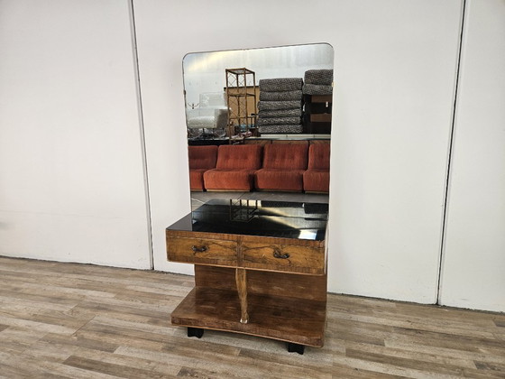 Eleganter Schminktisch im Art-déco-Stil der 1940er-Jahre mit großem, originalem Spiegel. Ideal für Schlafzimmer, Flur und Wohnzimmer.