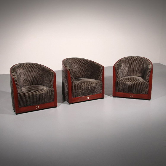 Dieses luxuriöse Set aus drei Decoforma-Sesseln von Frits Schuitema, kombiniert mit einem atemberaubenden Mahagoni-Beistelltisch im Art-déco-Stil, strahlt Eleganz und handwerkliches Können aus. Handgefertigt mit einem Gestell aus Bubinga-Holz und elegantem blaugrauem Rippenbezug, vereint dieses Set zeitloses Design mit hochwertigen Materialien. Perfekt für ein stilvolles Wohn- oder Schlafzimmer, bietet es Komfort und Eleganz zugleich. Die Wahl von Vintage-Möbeln wie diesen wertet nicht nur Ihre Einrichtung auf, sondern fördert auch die Nachhaltigkeit.