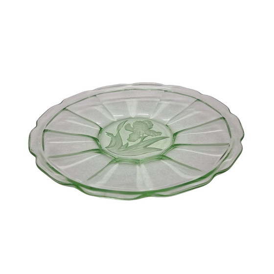Art Deco Uranium Schale mit Iris, aus den 1930er Jahren. Schöne Schale mit leicht gewelltem Rand mit einem Ausschnitt einer Iris in der unteren Mitte. Der Zustand ist sehr gut für sein Alter, einige Gebrauchsspuren und Luftblasen. Maße: 28 cm Durchmesser und 3,5 cm Höhe. Nr.6665
