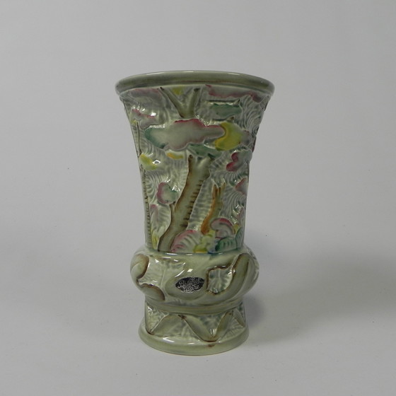 Reich verzierte Vase aus der Zeit des Art déco mit Bäumen, gelben und rosa Blättern und .... 1 Kaninchen! Höhe: 23,5 cm. Ø: 15 cm. Herkunft: Großbritannien, 1930er Jahre. Material: Keramik.