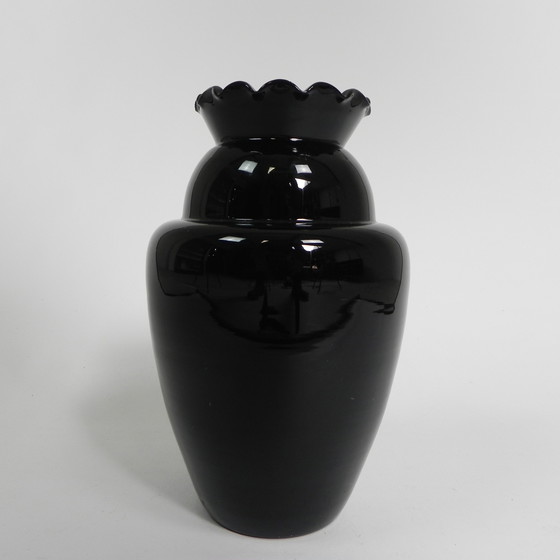 Modell aus der Zeit des Art déco aus dickwandigem, sehr dunkelviolettem Glas mit gewelltem Kragen.