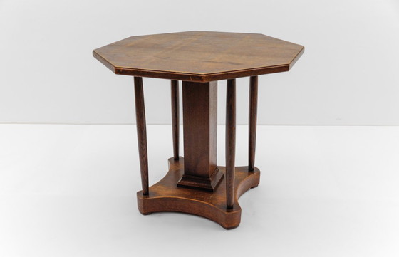 Dieser exquisite Art Deco Tisch aus den 1940er Jahren, gefertigt in Deutschland, verkörpert die Eleganz und den Stil einer vergangenen Ära. Mit seiner achteckigen Tischplatte und den kunstvoll gestalteten Beinen fügt sich dieses Möbelstück nahtlos in jede anspruchsvolle Einrichtung ein.