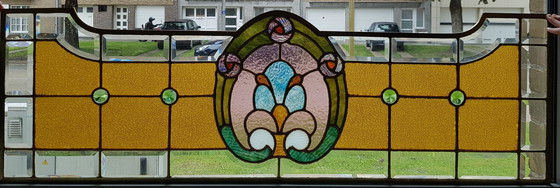 Große Fensterfront aus einem Stück: 45 cm hoch x 145 cm breit. Art Deco mit floralem Muster in Anlehnung an den Jugendstil. Geprägte Ränder in weißem Glas. Ausgezeichneter Zustand.