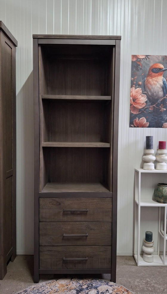 Das Bücherregal/der Aufbewahrungsschrank ist größtenteils aus massivem Kiefernholz mit einem Metallgestell gefertigt. Es ist rauchgrau mit einem altgrauen Metallgestell. Der Schrank verfügt über drei Schubladen mit Soft-Close-System und drei offene Fächer.