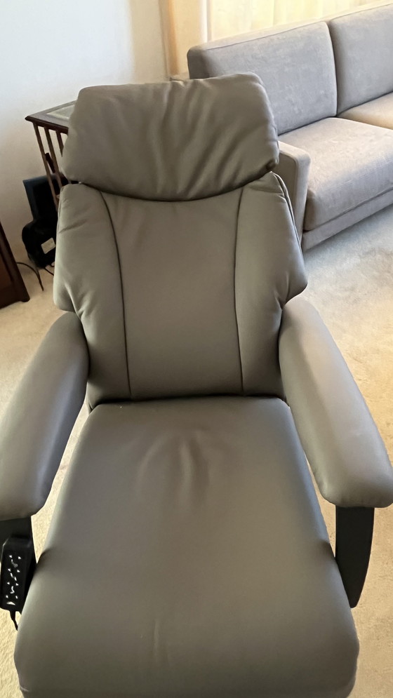 Genießen Sie ultimative Entspannung mit diesem eleganten Relaxsessel, der sich nahtlos in jedes moderne Wohnzimmer einfügt. Die stilvolle graue Lederausstattung macht diesen Sessel zum Blickfang in Ihrem Zuhause.