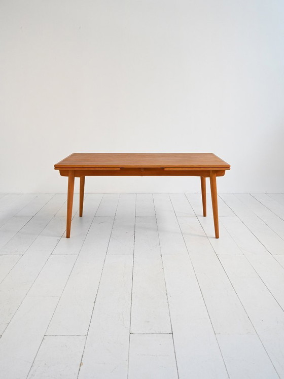 Der Esstisch Modell „AT 312“ wurde von Hans J. Wegner entworfen und in den 1950er-Jahren von Andreas Tuck in Dänemark gefertigt. Er besteht aus Eiche und verfügt über zwei integrierte Ausziehplatten, die eine nahtlose Erweiterung der Tischplatte ermöglichen und gleichzeitig die Material- und Optikkontinuität wahren. Die Stempelmarke „Andr. Tuck – Design Hans J. Wegner – Made in Denmark“ bestätigt seine Authentizität und Originalproduktion. Das Design verkörpert Wegners Philosophie, die als eine der führenden Persönlichkeiten des skandinavischen Modernismus die klare Struktur und die Veredelung der Holzverarbeitung in den Mittelpunkt stellte. Die ausgewogenen Proportionen und die essentielle Struktur spiegeln die raffinierte Strenge des dänischen Designs der 1950er-Jahre wider, in dem Funktion und Handwerkskunst zu einem zeitlosen Ausdruck verschmelzen. Altersbedingte Gebrauchsspuren sind möglich. Bitte beachten Sie die Fotos.