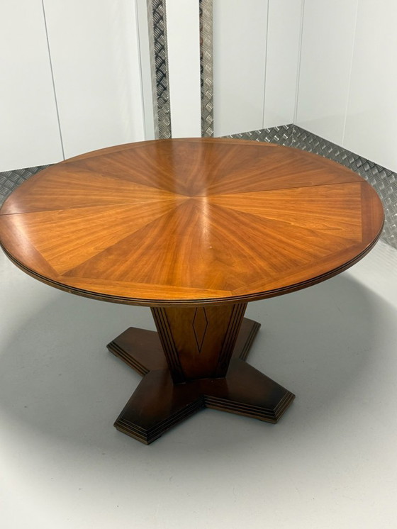 Ausziehbarer runder Esstisch im Art-Deco-Stil mit Sonnenmusterfurnier