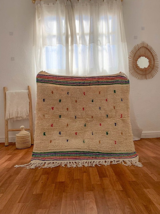 Tauchen Sie ein in die zeitlose Eleganz dieses authentischen Berberteppichs aus Wolle mit großzügigen 200 x 200 cm. Dieses exquisite Stück zeugt von traditioneller Handwerkskunst und besticht durch seine weiche Textur und die kunstvollen Muster, die das reiche kulturelle Erbe der Berberhandwerker widerspiegeln.