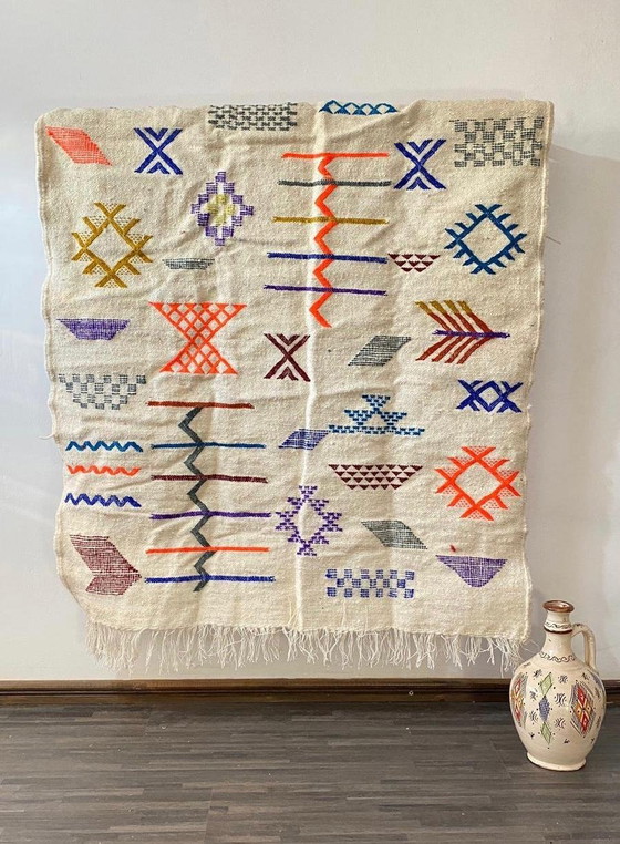 Der Teppich ist reich verziert mit traditionellen Berbersymbolen in leuchtenden Farben, von denen jedes eine tiefere Bedeutung und eine Geschichte über Handwerk und Kultur hat. Der helle Untergrund in Kombination mit der farbenfrohen geometrischen Stickerei macht diesen Kelim-Teppich zu einer stilvollen und vielseitigen Ergänzung für jedes Interieur.