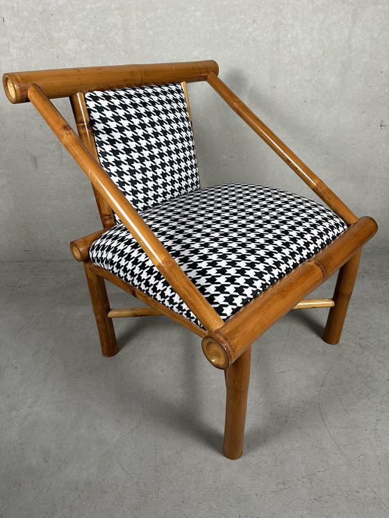 Bemerkenswerter Stuhl aus Bambus mit lustigem Stoff (Pied de Poule-Muster). Sehr starker Rahmen. Der Lack auf dem Rahmen sieht noch sehr schön aus. Der Stoff fühlt sich gut an. Gepflegter Zustand. Ein Blickfang. Hat etwas Ibiza Vibes. Breite: 65cm. Höhe: 79cm. Tiefe: 63cm. Sitzhöhe: 44cm.