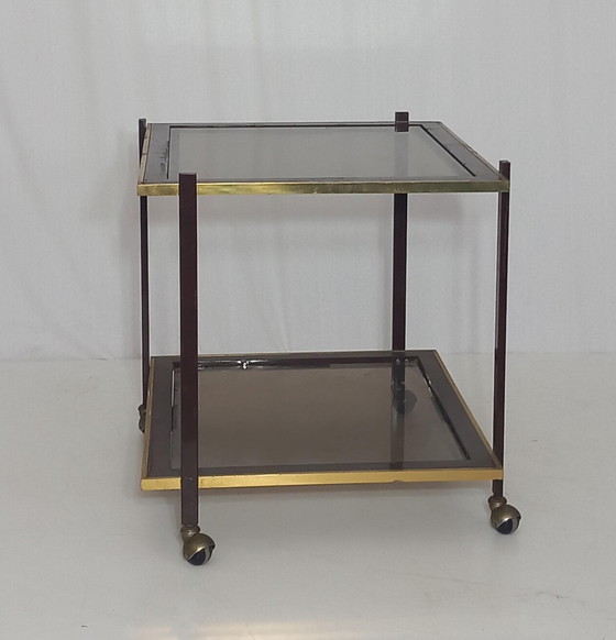 Wir stellen einen Barwagen aus der Mitte des Jahrhunderts vor, der die ikonische Designästhetik der 70er Jahre zeigt. Die Struktur des Barwagens besteht aus Metall, während die Auflageflächen aus Glas sind. Dieses klassische Stück verleiht jeder Einrichtung einen Hauch von Eleganz, indem es Schlichtheit und Minimalismus durch seine klaren, einfachen Linien präsentiert. Der Barwagen verfügt über zwei Ablageflächen aus dunklem Glas, die reichlich Platz für Ihre Lieblingsgetränke und -gläser bieten. Es geht nicht nur um Stil, sondern auch um Funktionalität. Die kleinen Räder sorgen für einfache Mobilität, so dass Sie Ihre Gäste mühelos bedienen oder den Wagen verschieben können, um ihn an Ihre wechselnden Einrichtungswünsche anzupassen. Erleben Sie die zeitlose Anziehungskraft des Mid-Century-Designs und bringen Sie mit unserem Barwagen aus Walnussholz aus den 70er Jahren einen Hauch von Retro-Charme in Ihr Zuhause.