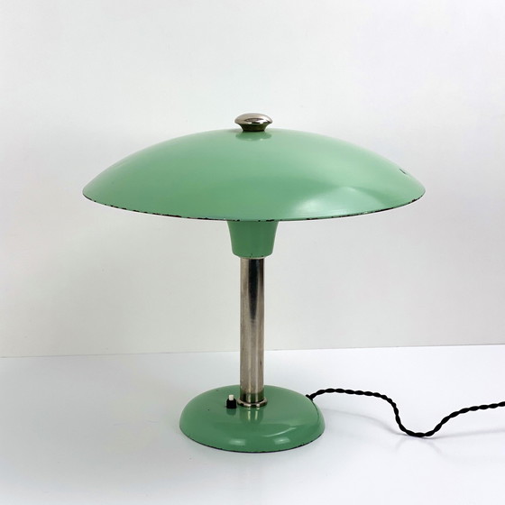 Große Tischlampe, entworfen von Max Schumacher 1934 für Werner Schröder, Lobenstein, Deutschland. Dieses ikonische Modell spiegelt perfekt das Bauhaus-Design wider und vereint Funktionalität mit zeitloser Eleganz. Materialien: Verchromtes und grün lackiertes Metall Sehr guter Vintage-Originalzustand mit einigen diskreten alters- und gebrauchsbedingten Spuren, die auf den Detailfotos zu sehen sind. Elektrifizierung erneuert, Fassung: E27 klassisch oder Led Abmessungen: Durchmesser: 43 cm, Höhe: 41 cm. Professioneller Versand auf Anfrage. International shipping. Lieferung in Frankreich per Cocolis oder Postversand auf Anfrage möglich. Mitglied der Gewerkschaft der Antiquitätenhändler (sncao)