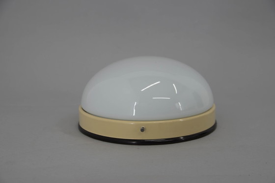 Sockel aus Bakelit und Metall, Schirm aus Opalglas.