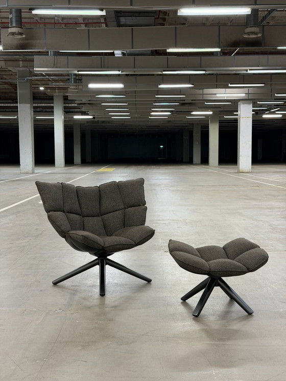 Dieser Husk-Sessel mit passendem Hocker des italienischen Designhauses B&B Italia ist mit einem wunderschönen, hochwertigen Wollstoff bezogen, dessen feine, dezente Struktur den komfortablen Charakter dieses Modells perfekt unterstreicht. Die großzügigen Kissen bilden die charakteristischen „Blütenblätter“, für die dieses Design bekannt ist, und bieten ein besonders entspanntes Sitzerlebnis. Das Set mit Originalbezug ist neuwertig und wurde stets pfleglich behandelt, sodass sowohl der Stoff als auch das Design voll zur Geltung kommen.
