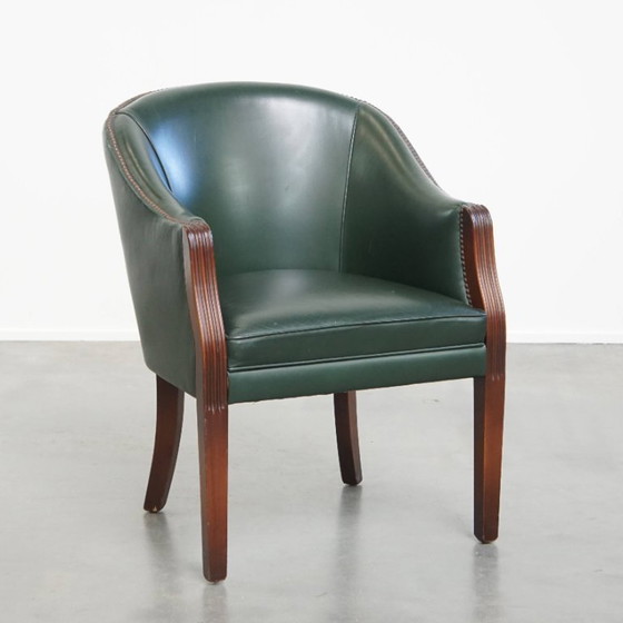 Angeboten wird dieser zeitlose Beistell-/Ess-/Bürostuhl aus grünem Rindsleder und Holz im englischen Stil.