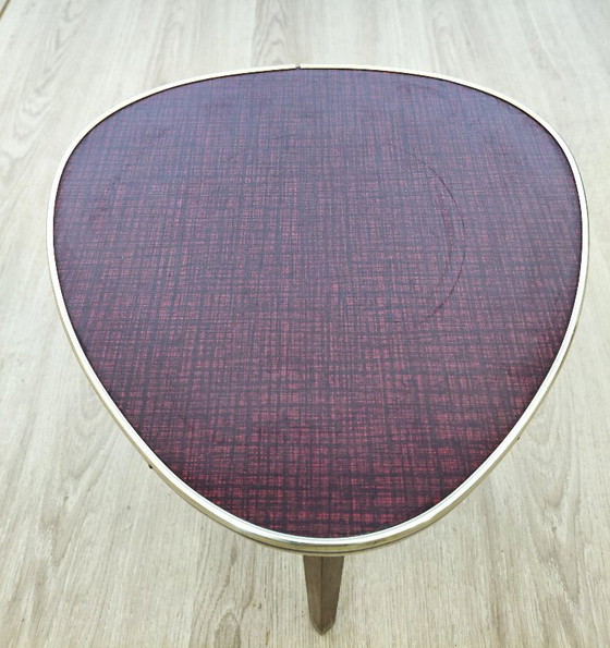 Schöner Beistelltisch oder Pflanztisch aus den fünfziger Jahren mit dunkelrot karierter Platte. auf der Oberseite sehen Sie einen Kreis sonst ist es ok siehe Fotos