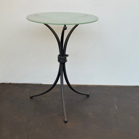 Beistelltisch mit mattierter Glasplatte und dekorativem Stahlfuß. Wir haben 2 Stück, siehe auch andere Anzeige. Aus der Sammlung von De Zaak Design und Beratung.