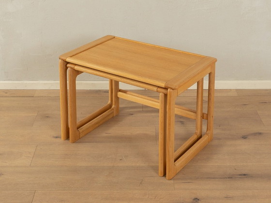 Klassische Satztische aus den 1960er-Jahren. Stabiles Gestell mit Tischplatte aus Eichenfurnier und Massivholzkanten. Hergestellt in Dänemark. Gut restaurierter Zustand mit leichten Gebrauchsspuren.