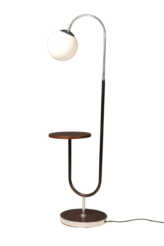 Diese elegante Art-Déco-Stehleuchte aus den 1930er Jahren wurde vom renommierten tschechischen Designer Jindřich Halabala für UP Závody Brno entworfen. Die Leuchte verbindet Funktionalität mit anspruchsvoller Ästhetik und spiegelt die charakteristischen Merkmale der Zwischenkriegsmoderne wider. Das einzigartige Design besteht aus einem gebogenen Metallrahmen mit einem integrierten runden Tisch, der sie nicht nur zu einer Lichtquelle, sondern auch zu einem praktischen Wohnaccessoire macht. Die Opalglaskugel spendet weiches, diffuses Licht und trägt zu einer gemütlichen Atmosphäre bei. Dank ihres zeitlosen Aussehens und ihrer hochwertigen Verarbeitung ist diese Leuchte ein begehrtes Sammlerstück und eine stilvolle Ergänzung sowohl für historische als auch für moderne Interieurs. Abmessungen: Höhe: 168 cm Tischdurchmesser: 35,5 cm Sockeldurchmesser: 40 cm Durchmesser der Glaskugel: 25 cm Zeitraum: 1930er Jahre Herkunft: Tschechoslowakei Hersteller: UP Závody Stil: Art Deco, Funktionalismus Material: Metall, Glas, Holz Zustand: Gut original, voll funktionsfähig