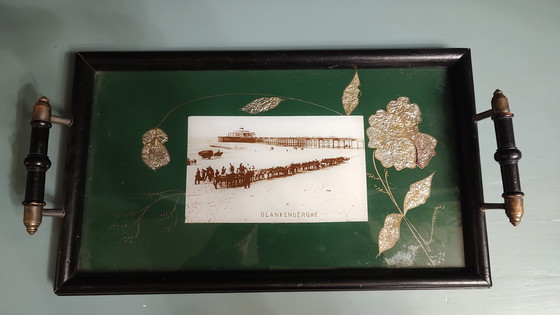 Das Vintage-Tablett ziert eine eingelegte, historische Sepia-Fotografie des ursprünglichen Blankenberge-Piers aus der Zeit um 1907. Das Foto zeigt den gusseisernen Pier, der 1894 erbaut und 1914 im Ersten Weltkrieg von den Deutschen niedergebrannt wurde. Das Tablett ist in gutem Zustand mit leichten Gebrauchsspuren. Einzigartiges Antikstück.