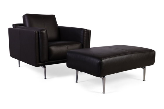 Bellice Sessel + Hocker 100x57 von Leolux / komplett in Negev 210 Nervio Leder / Grazio polierte Aluminiumbeine / Sesselmaße 88x88x83hg, Hockermaße 102x58x41hg. Die gezeigten Bilder stellen das Produkt tatsächlich dar.