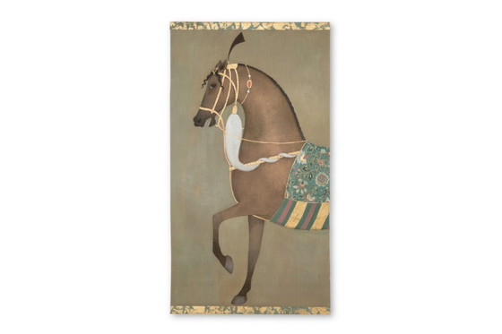 Bemalte Leinwand mit einem stilisierten indischen Pferd im Profil.