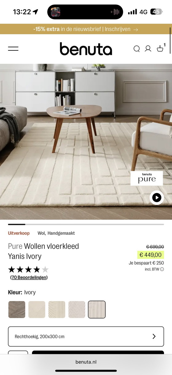 ZustandAusgezeichnetFarbenCremeMaterialWolleAnzahl der Artikel1MarkeBenutaHöhe200 cmBreite300 cmTiefe2 cm