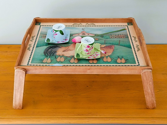Bettplatte aus massivem Akazienholz im Art-Deco-Stil mit Klappbeinen zum einfachen Verstauen und zwei integrierten Griffen an den Seiten zum einfachen Verschieben; in der Mitte ist ein Gemälde mit einer ländlichen Landschaft mit einer Kirche und Hühnern zu sehen; trotz seines Alters ist es in gutem Zustand. Er ist vielseitig einsetzbar, ob zu Hause für das Frühstück im gemütlichen Bett, oder um den Computer abzustellen und einen Film anzuschauen oder zu arbeiten, die Füße sind stabil und sorgen für einen sicheren Stand; Höhe ausgeklappt 21 cm Breite 47 cm Tiefe 34 cm Höhe zusammengeklappt 5 cm Gewicht 0,760 Kg
